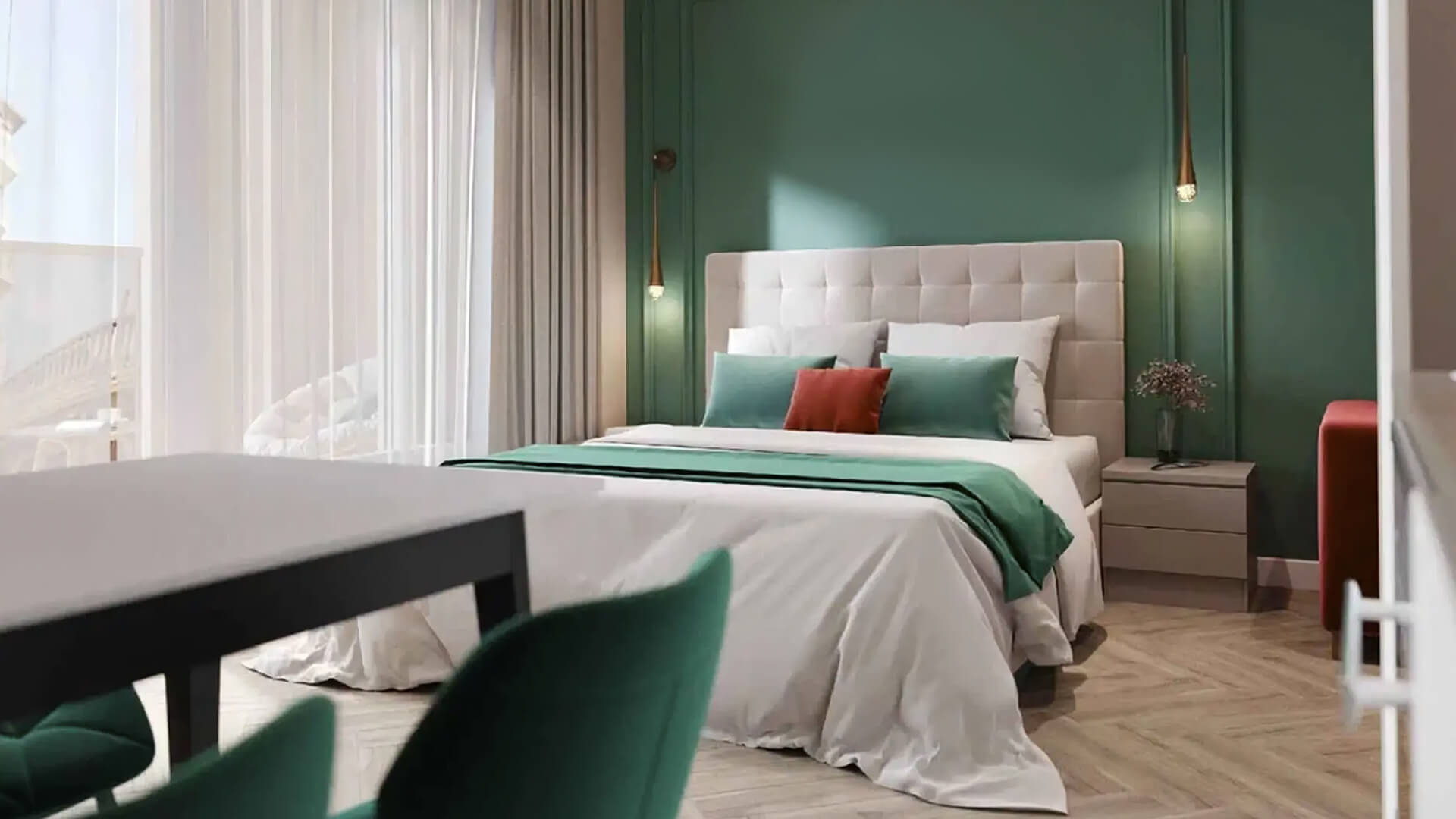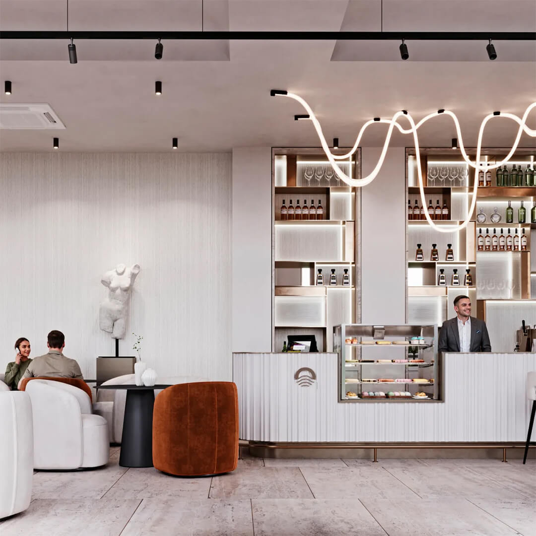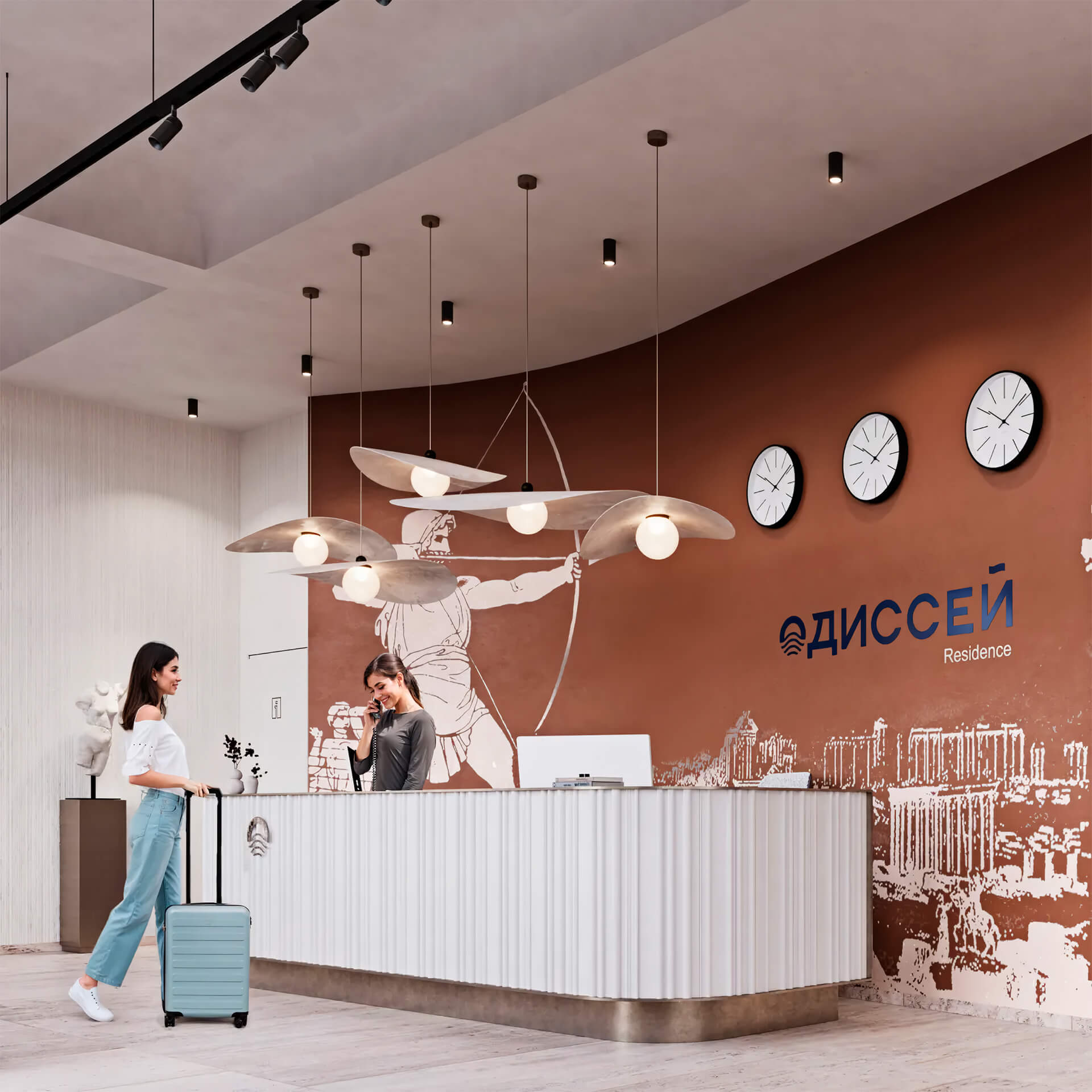 Интерьеры «Одиссей Residence» выполнены в элегантном современном стиле, сочетающем функциональность и эстетику. Просторное лобби с дизайнерской отделкой, мягким освещением и уютными зонами ожидания создаёт атмосферу респектабельности и уюта с первых шагов.